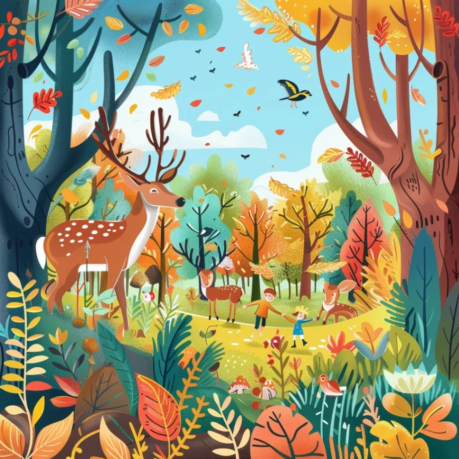 One of the best things about nature is the changing seasons. In the fall, the leaves turn bright red, orange, and yellow. It looks like the trees are wearing colorful coats! The air gets cooler, and it's fun to jump in piles of leaves. Seeing a deer with its white-spotted fawn is also a pleasure.