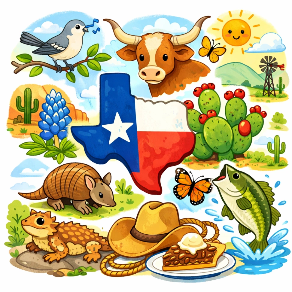 Texas has many things that make it special. The flag, the flower, the bird, the cow, and even the pie all help tell the story of Texas!